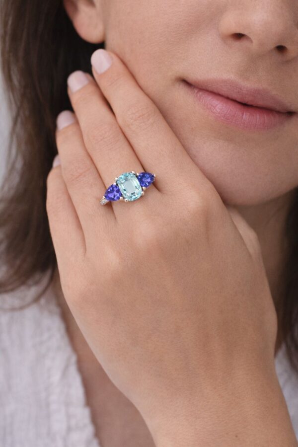 – Una Agua Marina natural, central y talla oval con un peso de 2,31 quilates, engastado con 4 garras. Calidad extra (AAA). Dos Tanzanitas naturales, talla trapecio con un peso total de 1,31 quilates, engastadas con garras. Calidad extra (AAA)