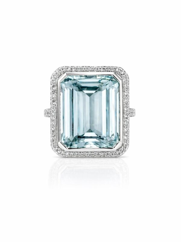 – Una aguamarina natural, central y talla octogono con un peso de 8,22 quilates, engastada con su bisel y calidad extra (AAA). 52 diamantes naturales, en orla con talla brillante con un peso total de 0,62 quilates, engastadas en grano, VS – H.