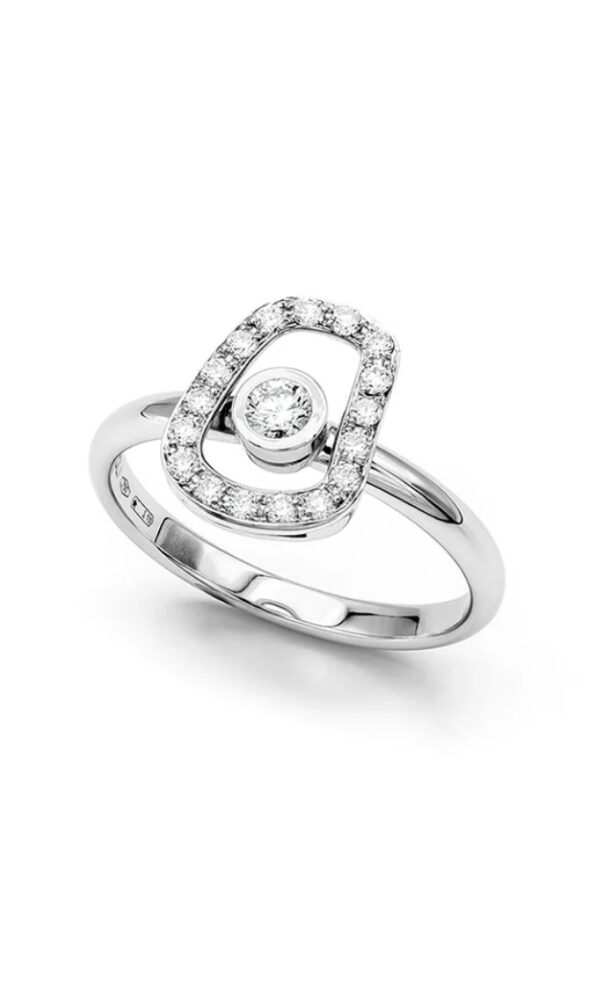 La distintiva geometría de la colección Puzzle, inspirada en las obras de Calder, se expresa en una forma ligera y delicada. Estas creaciones presentan un armonioso juego de sólidos y vacíos, perfectamente combinado con el brillo de los diamantes, que da como resultado un diseño versátil ideal para realzar el estilo personal en cualquier ocasión. Cada anillo Puzzle Diamonds exhibe una piedra central, un diamante que simboliza la feminidad y la sofisticación, captando la luz y la atención de forma única. Una oda a la tradición orfebre italiana, donde el juego de formas se convierte en poesía llevable.