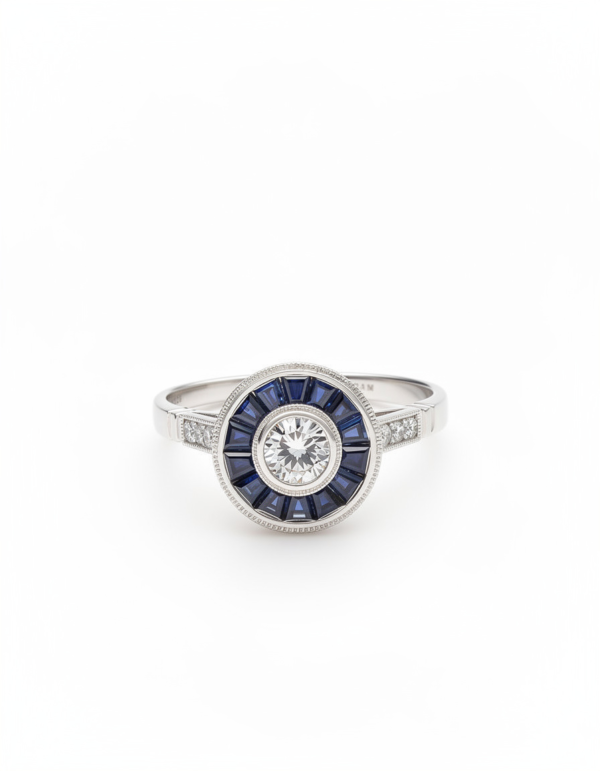 Anillo «ojo de perdiz» con Diamante central y Zafiros.