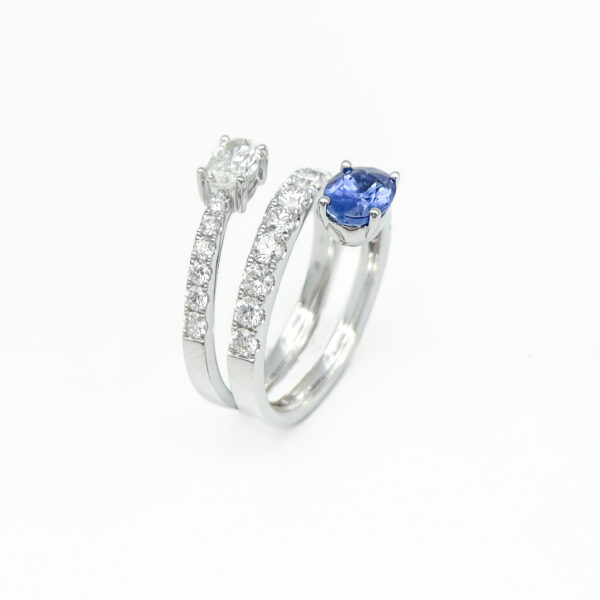 Espectacular anillo «tu y yo» con doble aro, en oro blanco, con diamantes y Zafiro, sortija perfecta para ese regalo tan especial y poder disfrutar en cualquier ocasión. Colección propia.