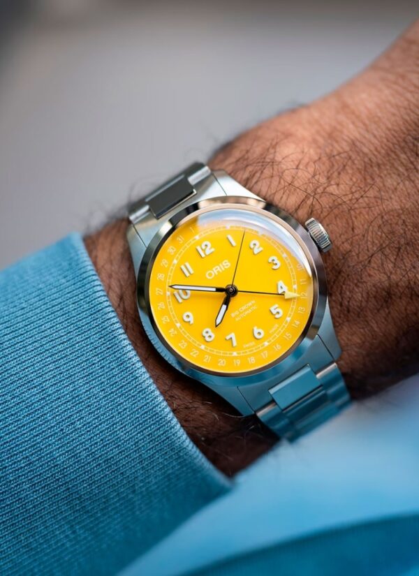 Este Big Crown Pointer Date tiene una esfera Amarilla elegante. Alrededor, una caja de acero inoxidable de 40,00 mm engastada en una pulsera de eslabones en H con un cierre desarrollado por Oris que abraza perfectamente la muñeca. Nuestro icono renace.