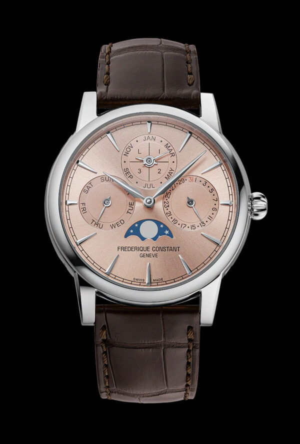 Cuando se lanzó en 2016, el Classic Perpetual Calendar Manufacture de Frederique Constant era el calendario perpetuo más asequible del mercado relojero. Hoy, la pieza lleva aún más lejos la calidad y el acabado de los componentes, así como las características técnicas de su movimiento. Su esfera se viste del color favorito de los coleccionistas, el salmón, sobre una caja de