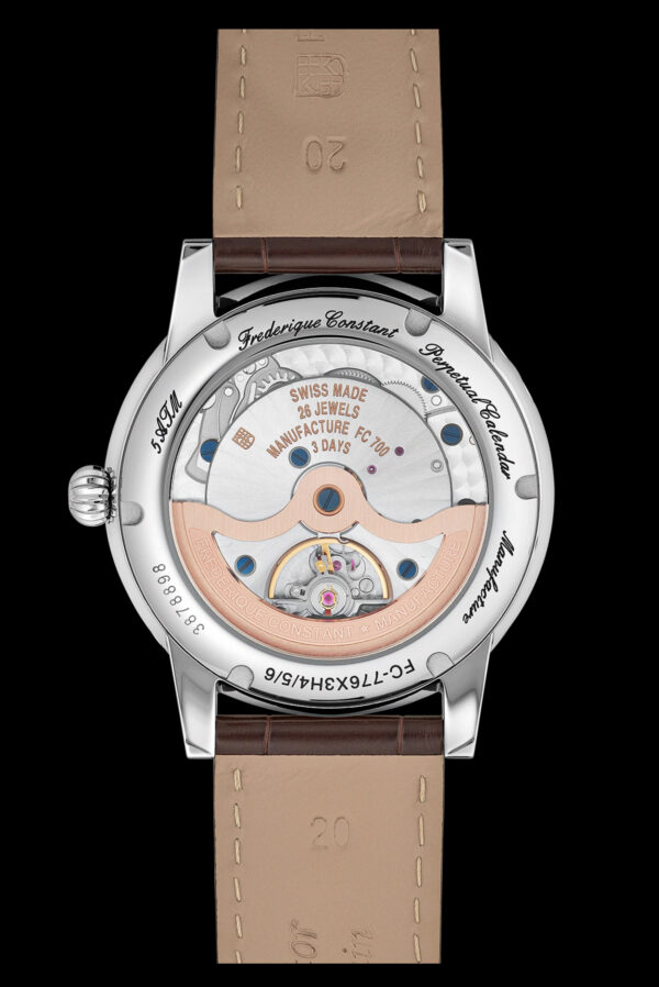 La classic perpetual calendar manufacture alberga el calibre de manufactura fc-776, el número 34 desarrollado internamente por el relojero ginebrino, cuya reserva de marcha se ha aumentado a tres días. su esfera se viste del color favorito de los coleccionistas, el salmón, sobre una caja de acero disponible en un diámetro de 40 mm.