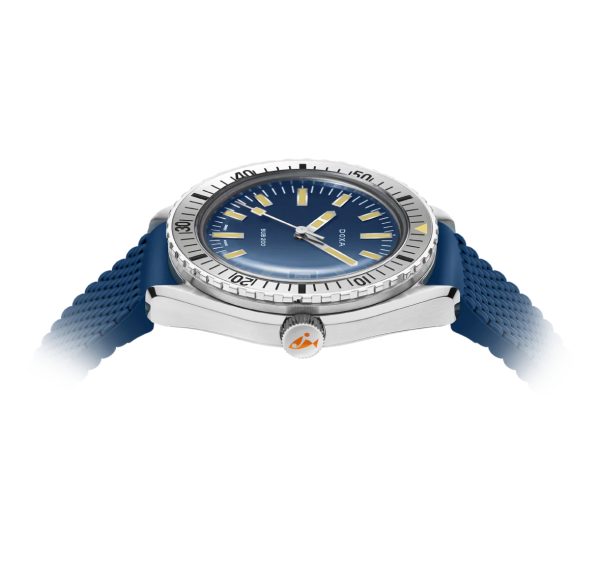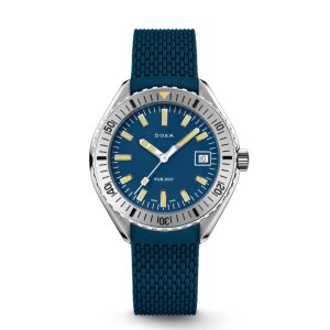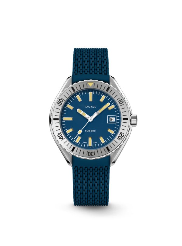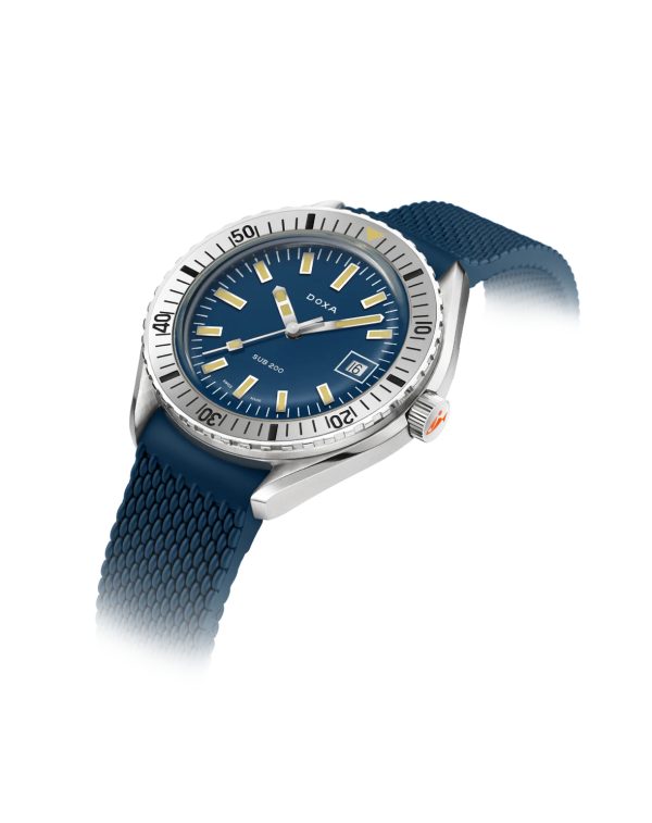 Presentado en 2019, este reloj de buceo de 3 agujas tiene una caja fabricada en acero inoxidable 316L de la más alta calidad. Con un diámetro de 42 mm, el SUB 200 está coronado por un cristal de zafiro resistente a los arañazos con revestimiento antirreflejos y la curvatura distintiva del plexiglás abombado utilizado en su día. Sumergible hasta una profundidad de 200 metros (20 ATM), el modelo cuenta con un bisel giratorio unidireccional. Todos los elementos que proporcionan información relevante para el buceo, incluido el bisel, tienen un revestimiento luminiscente Super-LumiNova®. El brazalete es de acero inoxidable 316L e incorpora un cierre desplegable con el símbolo del pez DOXA.