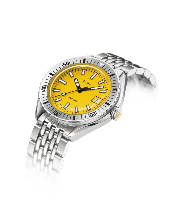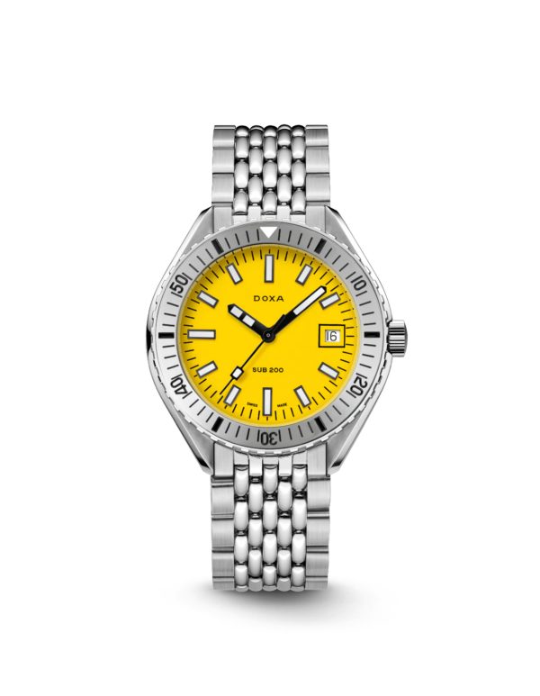 Presentado en 2019, este reloj de buceo de 3 agujas tiene una caja fabricada en acero inoxidable 316L de la más alta calidad. Con un diámetro de 42 mm, el SUB 200 está coronado por un cristal de zafiro resistente a los arañazos con revestimiento antirreflejos y la curvatura distintiva del plexiglás abombado utilizado en su día. Sumergible hasta una profundidad de 200 metros (20 ATM), el modelo cuenta con un bisel giratorio unidireccional. Todos los elementos que proporcionan información relevante para el buceo, incluido el bisel, tienen un revestimiento luminiscente Super-LumiNova®. El brazalete es de acero inoxidable 316L e incorpora un cierre desplegable con el símbolo del pez DOXA.