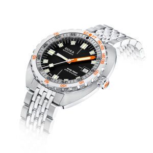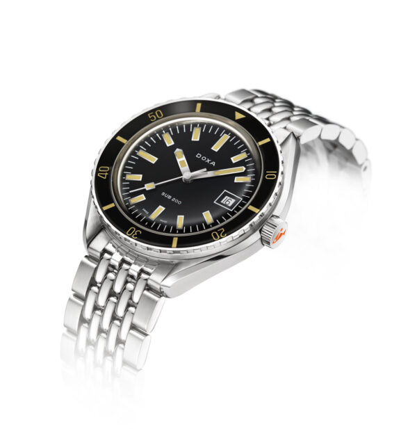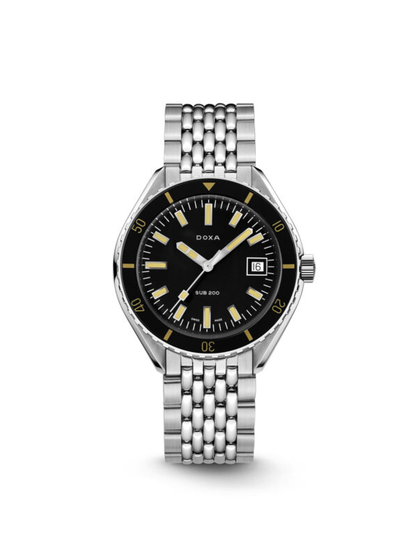 Presentado en 2019, este reloj de buceo de 3 agujas tiene una caja fabricada en acero inoxidable 316L de la más alta calidad. Con un diámetro de 42 mm, el SUB 200 está coronado por un cristal de zafiro resistente a los arañazos con revestimiento antirreflejos y la curvatura distintiva del plexiglás abombado utilizado en su día. Sumergible hasta una profundidad de 200 metros (20 ATM), el modelo cuenta con un bisel giratorio unidireccional. Todos los elementos que proporcionan información relevante para el buceo, incluido el bisel, tienen un revestimiento luminiscente Super-LumiNova®. El brazalete es de acero inoxidable 316L e incorpora un cierre desplegable con el símbolo del pez DOXA.