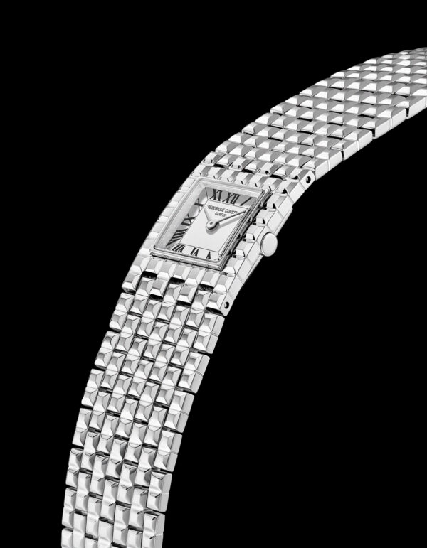 ¿Alguna vez has tenido la sensación de que la relojería es siempre más de lo mismo? Frederique Constant sabe perfectamente cómo renovar las cosas con estilo. La Manchette de la manufactura ginebrina, ausente de la colección durante más de veinte años, vuelve ahora con un toque sexy y glam-rock a lo que sin duda debe considerarse como el reloj de pulsera definitivo: una elegante pulsera con un patrón cuadrado Clou de Paris en relieve que se repite en la esfera (también cuadrada), disponible en cuatro versiones diferentes para satisfacer todos tus caprichos: una pieza con incrustaciones de joyas, dos alternativas minerales en malaquita y ónix, y una cuarta versión en acero mate.