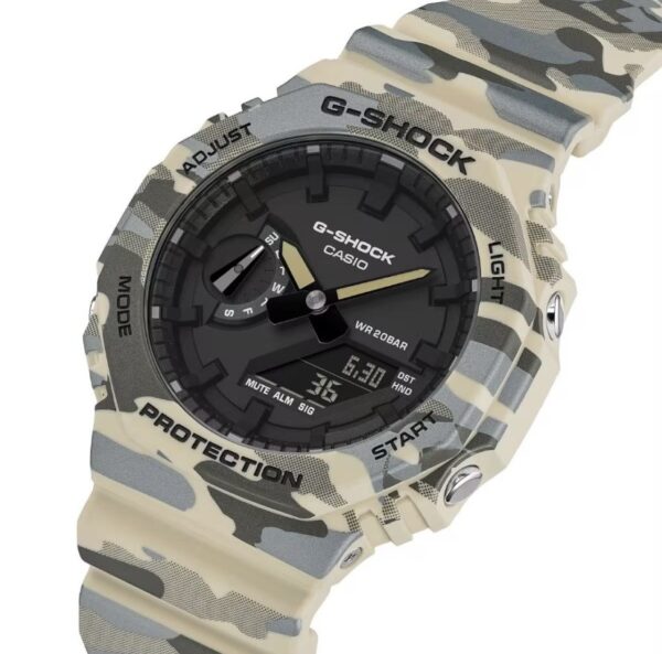 A la moda, con un toque de camuflaje: el siempre popular GA-2100 adopta un original patrón de camuflaje G-SHOCK que aporta un toque atrevido a cualquier estilo.