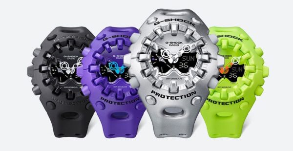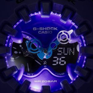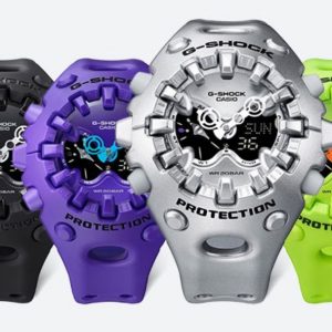 Su exterior combina formas orgánicas con bordes definidos, una gran pantalla LCD completa y una esfera metalizada que resalta su carácter robusto. Además, incorpora la innovadora manecilla de liberación de impactos, reflejando el compromiso de G-SHOCK con la durabilidad sin límites.
