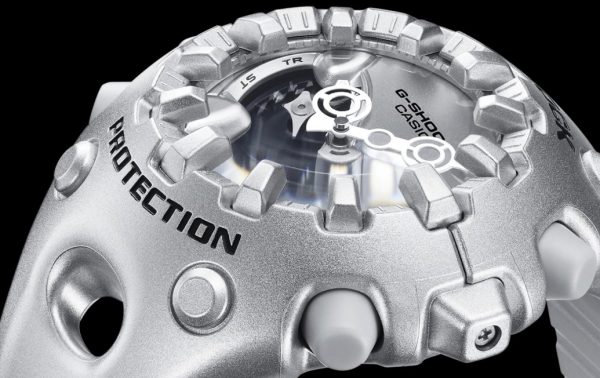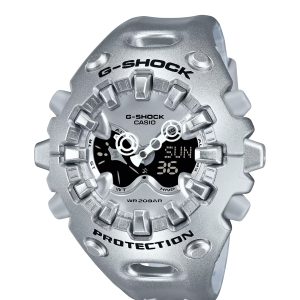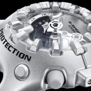 Su exterior combina formas orgánicas con bordes definidos, una gran pantalla LCD completa y una esfera metalizada que resalta su carácter robusto. Además, incorpora la innovadora manecilla de liberación de impactos, reflejando el compromiso de G-SHOCK con la durabilidad sin límites.