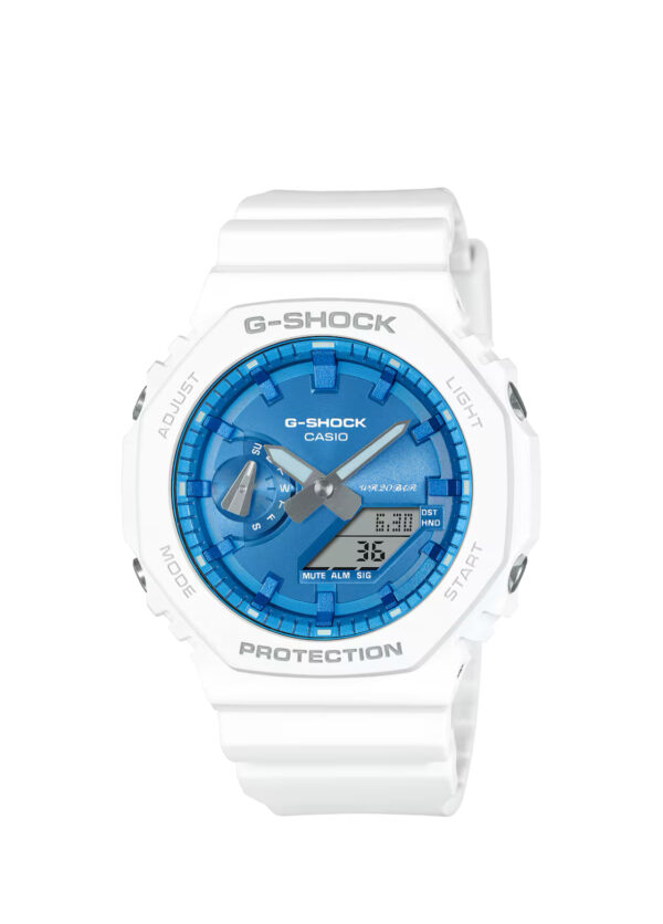 Elige a tu pareja favorita: el popular modelo GA-2100 octogonal y su homólogo más pequeño, el GMA-2100; el GM-2100 revestido de metal y su homólogo más pequeño, el GM-S2100; o el GA-110, con una esfera de gran dimensión hecha a mano con capas de componentes finamente detallados.