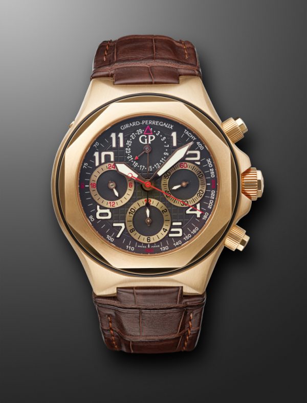 Girard-Perregaux Laureato Evo, una manufactura de piezas de Alta Relojería en el diseño y fabricación de calibres propios, Girard-Perregaux es de las pocas empresas relojeras Suizas que realiza íntegramente el proceso de fabricación. Así mismo, se la reconoce en el sector profesional como un modelo de maestría técnica y de independencia. Oro rosa, cristal de zafiro, movimiento automático, cronógrafo, 4 indicadores en el dial, segundos, minutos y horas, fecha. Manillas luminiscentes, diámetro 42 mm, sumergible 50 metros, corona roscada a la derecha, dos pulsadores roscados, tapa trasera transparente, correa de piel marrón, cierre hebilla desplegable propio Girard Perregaux.