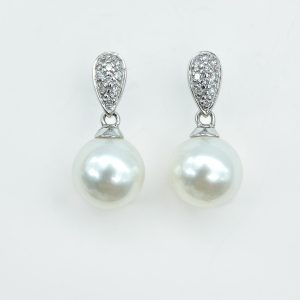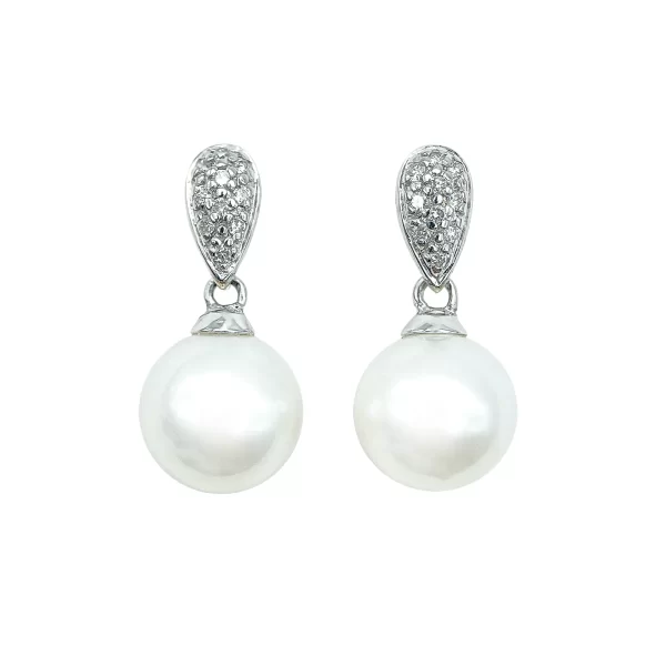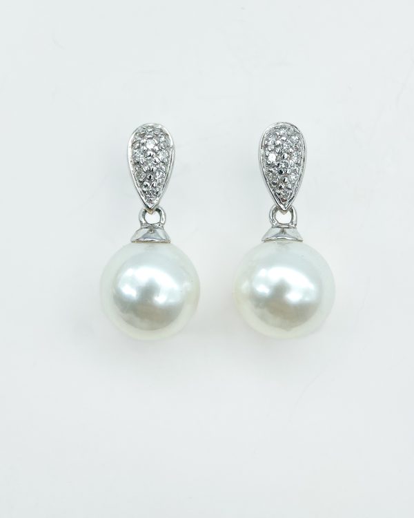 Clásico pendiente en oro blanco con perla cultivada, de tamaño intermedio.
