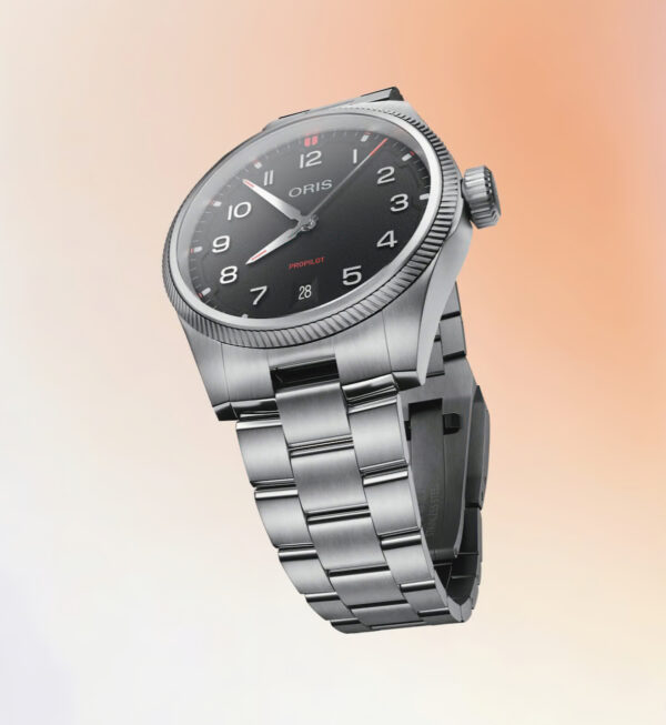 La caja de acero de 41,00 mm del ProPilot Date tiene líneas visuales fuertes y sencillas, y sin embargo, en la muñeca, su refinada ergonomía hace que sea muy cómodo de llevar. El acanalado característico sigue presente, inspirado en las turbinas del motor de un avión a reacción.