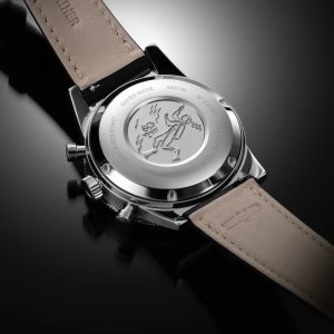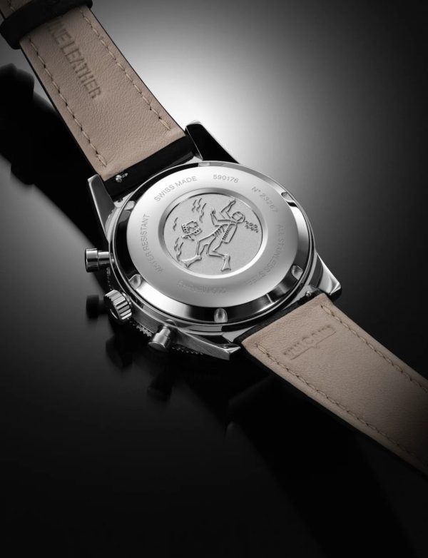 La esfera, disponible en negro mate o plata mate, cuenta con índices ultra legibles recubiertos de SuperLuminova, que garantizan la máxima visibilidad incluso en las condiciones más difíciles. El fiable y preciso movimiento cronógrafo automático ETA 7753 es el motor del reloj. Más que un simple reloj de buceo, este modelo también incorpora una escala decimal -un elemento poco común en relojería- que permite medir el tiempo en centésimas de minuto, haciendo que los cálculos y la interpretación de datos sean más prácticos para el buceo o el cronometraje deportivo. El grabado del fondo de la caja, que representa a un submarinista en acción, refuerza el ADN marítimo y aventurero del reloj.