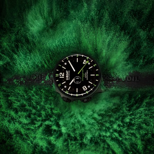 Caja de 45 mm con tratamiento DLC negro, CAPSOIL presenta una electromecánica, con funciones Chrono, completamente sumergida en un baño de aceite. El líquido aceitoso que rodea la esfera la transforma en un negro absoluto, haciéndola tridimensional y profunda. Este fluido crea en la esfera una burbuja de compensación en constante movimiento. Esta nueva versión cuenta con un innovador sistema de bloqueo (Locking ring system) con cambio rápido de batería.